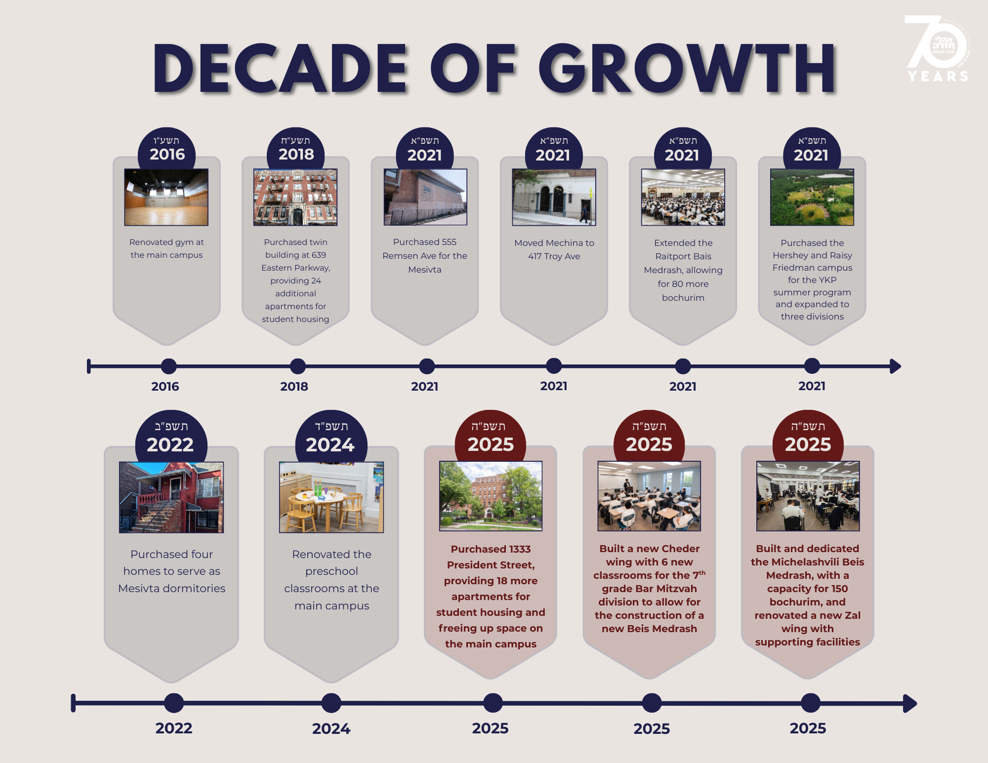 Rabbi Yehoshua Lustig offered a sweeping look at the past ten years at Oholei Torah, noting that as the Yeshiva approaches its seventieth year, this decade marks a powerful chapter of progress. He reflected on how much has changed since this age group was in Yeshiva as talmidim, highlighting the remarkable growth from year sixty to year seventy, the broadening support for parents and talmidim, and the ongoing challenge of operating with very limited space despite significant expansion efforts. For many attendees it was their first time hearing the full scope of how far the Yeshiva has come and how much more is needed as enrollment continues to rise.