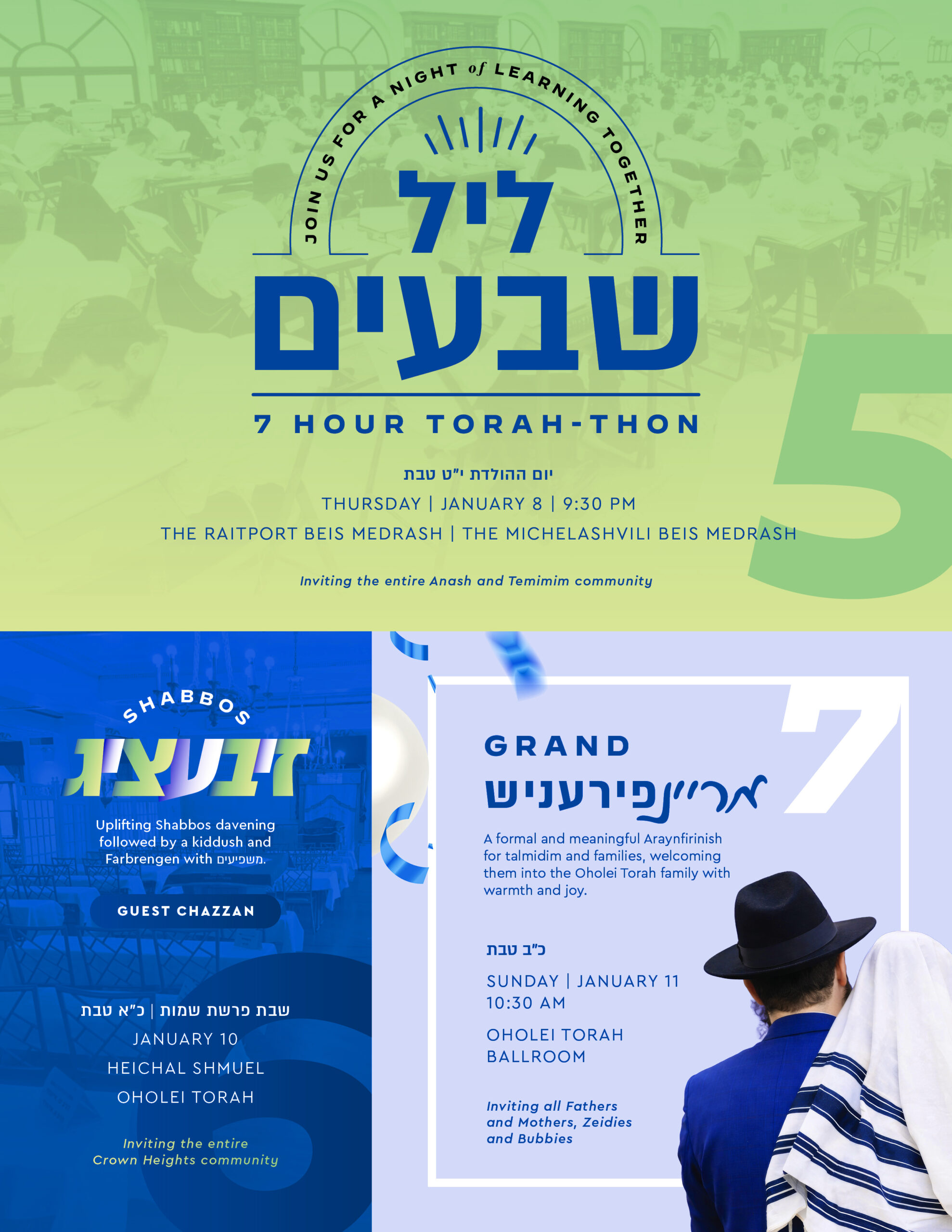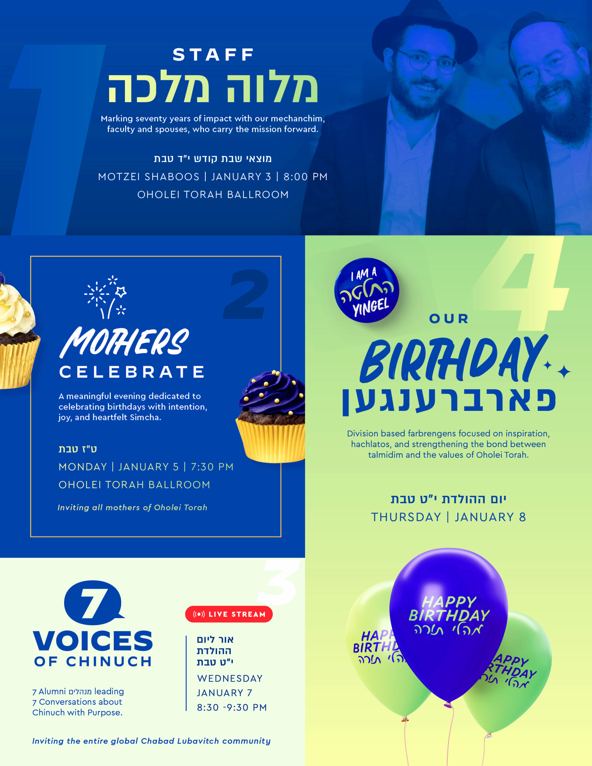 Oholei Torah will joyfully celebrate 70 Years of chinuch al taharas hakodesh this coming week on Yud Tes Teves, marking seven decades of shaping generations of talmidim with Torah, chassidishe values, and purpose. This milestone will be honored through 7 Events, each one celebrating the heart of chinuch and the vision that has guided Oholei Torah from its founding until today.