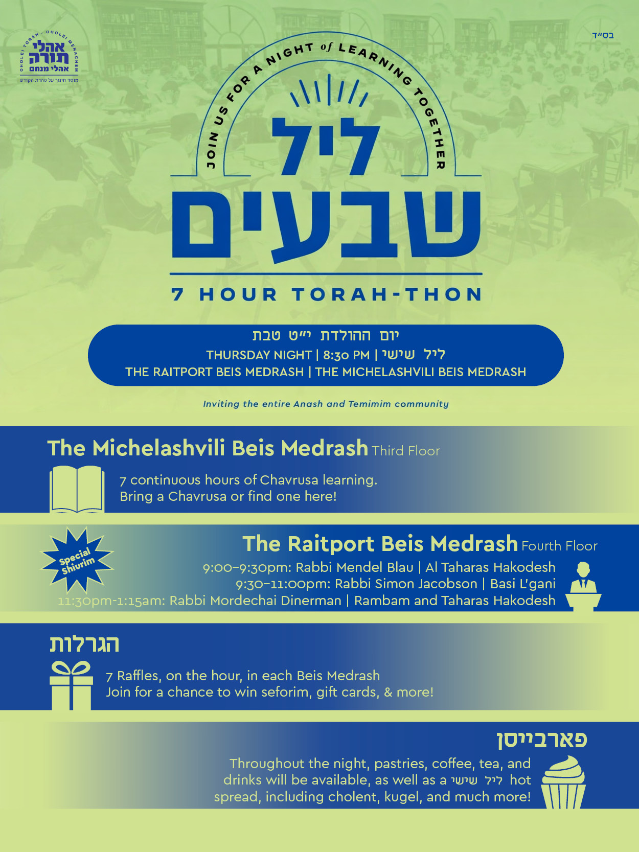 This evening, the celebration extends beyond the preschool and cheder divisions. Beis Medrash Oholei Torah is hosting a special Leil Shishi 7 hour Torah-thon, open to the community. Anash and Temimim are invited to join together in chavrusa learning, special shiurim by Rabbi Simon Jacobson and Rabbi Mordechai Dinerman, 7 raffles on the hour, and leil shishi hot spread.